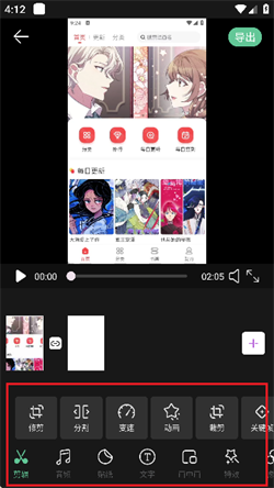 6、然后来到编辑器界面中,如图所示,界面下方是功能面板,其中有各种各样的工具。最后点击右上角的【导出】完成视频制作。