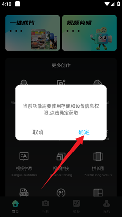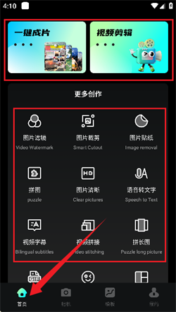 3、进入到软件首页,如图所示。这里能提供大量的剪辑创作工具,如一键成片,视频剪辑,图片滤镜,视频字幕等。