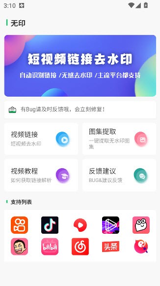 无印去水印app是有你游手游网整理的一款短视频去水印的软件,在无印去水印app中你可以体验到非常方便的水印去除功能哦,而且在多种去水印 体验来说还是很给力的,喜欢的话就来试试无印去水印app。