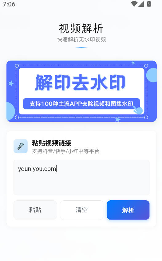解印去水印app是款免费好用的解析去水印工具,软件提供视频图集去水印功能,帮助你去除水印,支持解析各大平台去水印,软件界面简洁,作便捷,是你的好帮手。解印软件还支持快手、抖音、小红书、哔哩哔哩、皮皮虾等多款平台,还能解析图集批量下载。它界面操作简单,去水印效果好,还有批量处理功能,能帮用户高效清掉水印,还原内容原本的样子。虽说功能不算多,但单论去水印这件事,表现特别出色。要是你在找快速又好用的去水印工具,这款绝对值得试试。