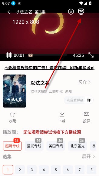 然后点击视频右上角的tv图标就可以电视投屏播放了